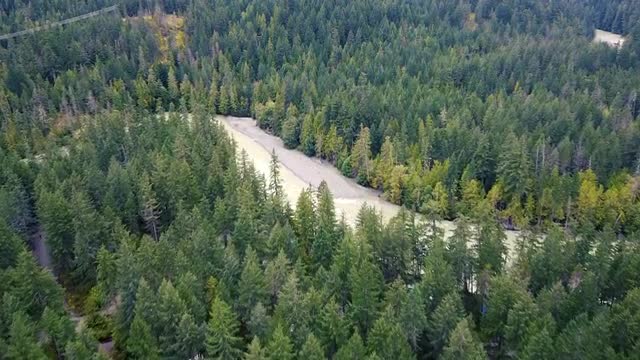 > Aerial shot of green spruce forest and wild river with rapids in Canada