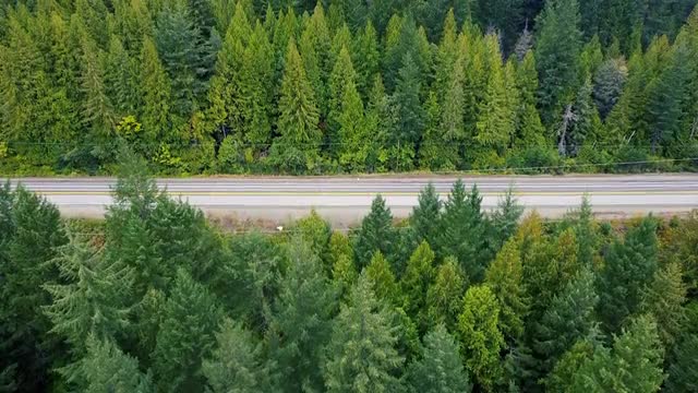 Aerial view of empty road in Canada, surrounded by green spruce forest