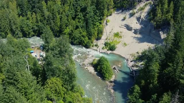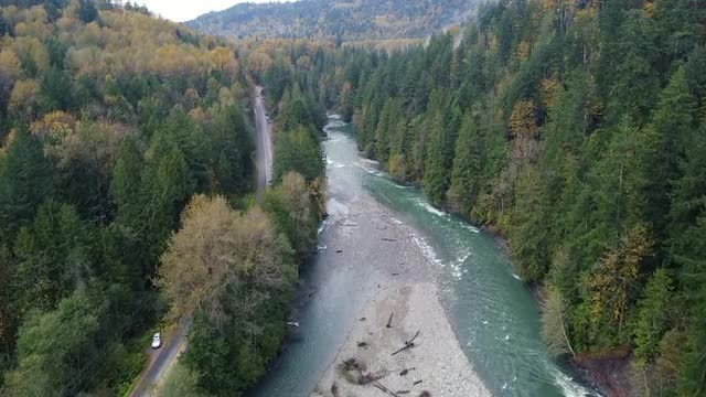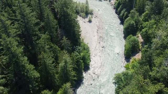> Fly over the bridge over wild river and railroad surrounded by forest