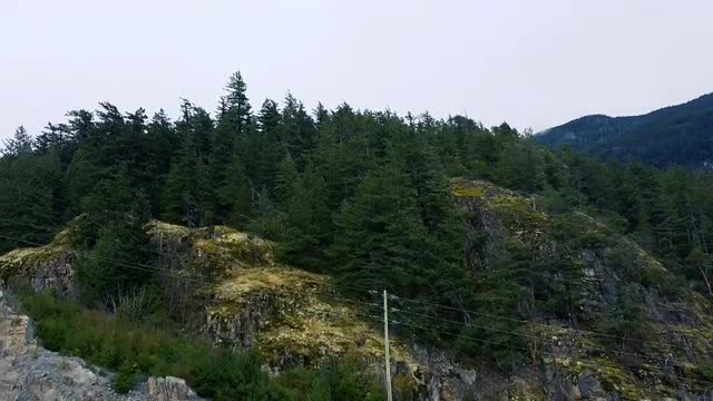 Drone shot of electrical lines in front of rocky mountain covered with trees