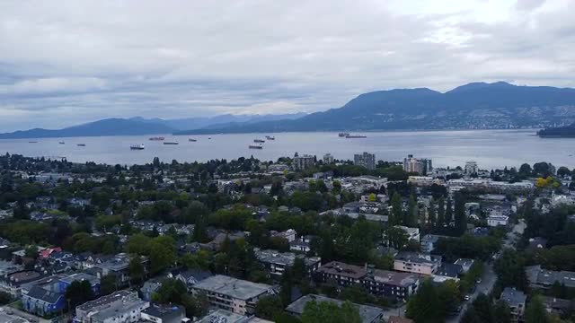 Top down view of Kitsilano, ships waiting and mountains on the background