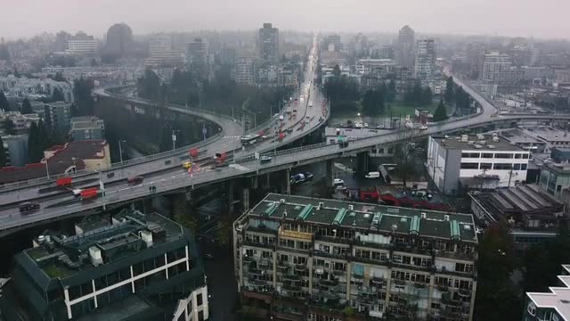 > Aerial view of Vancouver downtown on a sunny day with marina in front