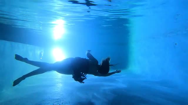 810115 - Pregnant woman swimming in the pool, underwater shot