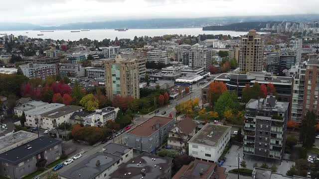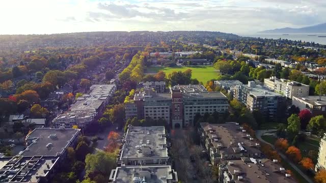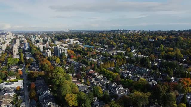 Aerial view of green to red trees in Vancouver suburbs