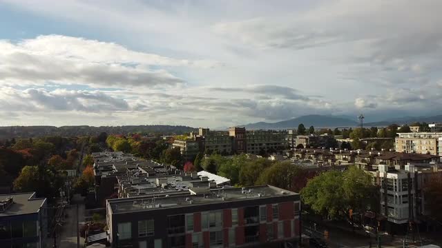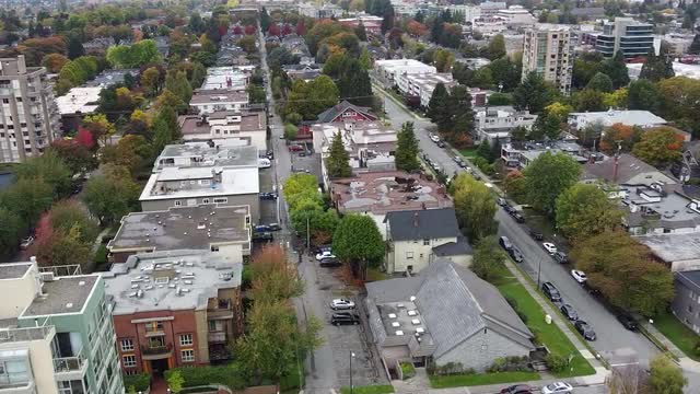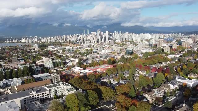 > Aerial view of green to red trees in Vancouver suburbs