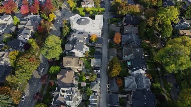> Top down view of Vancouver houses with green, orange and red trees on sunny day