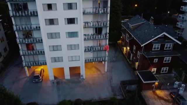 1127899 - Top down view of roofs and roads in Vancouver in the autumn evening