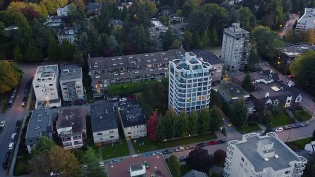 1129499 - Top down view of canadian roofs in the evening with green and orange trees