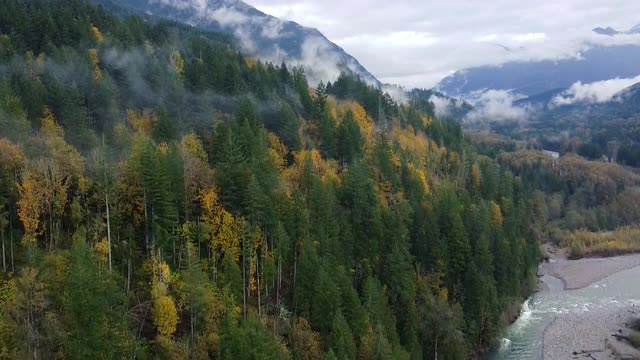 Aerial view of autumn forest and river in canadian valley with the low clouds