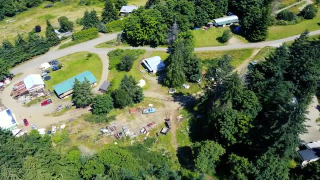 Aerial view of small house in the middle of the green forest. Remote place in Canada on a sunny day.