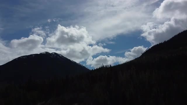 Epic aerial closing shot of the mountain covered with a bit of snow. With huge spruce forest in front and blue sky with puffy white clouds on a sunny day in Canada.