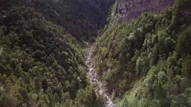 Epic aerial closing shot of the mountain covered with a bit of snow. With huge spruce forest in fron