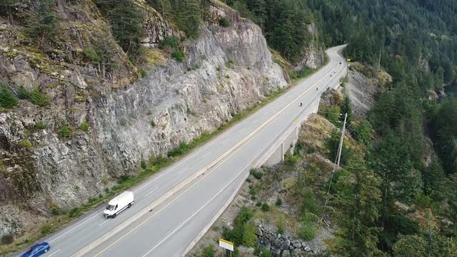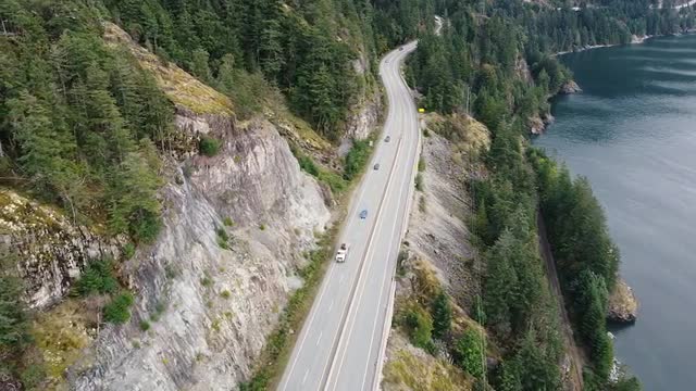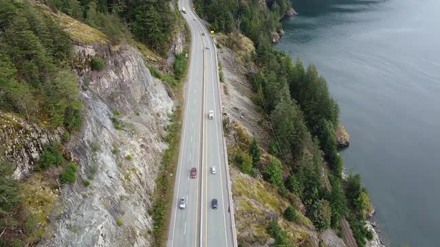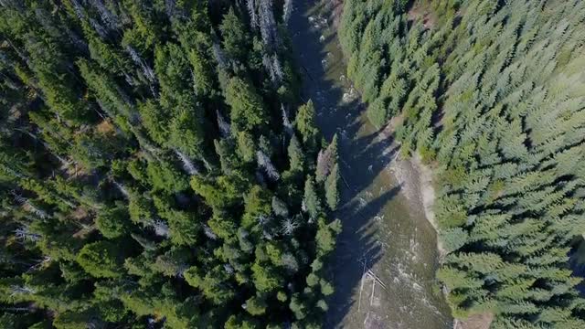 Aerial top down view of river rapids surrounded by green spruce forest in Canada.