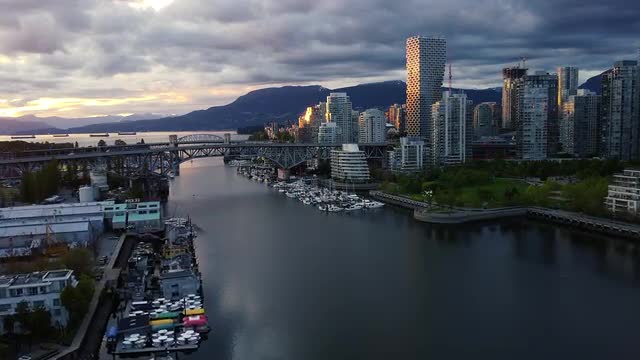 Vancouver downtown in sunset light with two bridges, creek and mountains behind