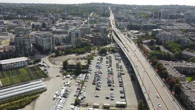 > Houses, railroad and pine trees in lonely city of British Columbia
