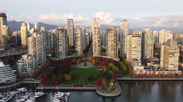 Top down view of Vancouver downtown in golden evening light with red green trees