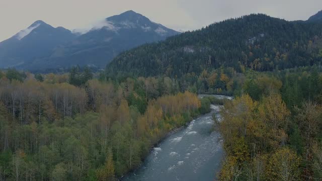 Drone shot of epic mountains and canadian river between yellow forest