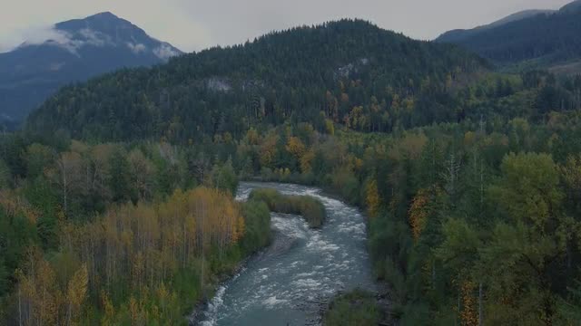 Drone shot of river rapids and fishermen in a valley during a fall