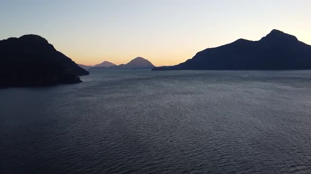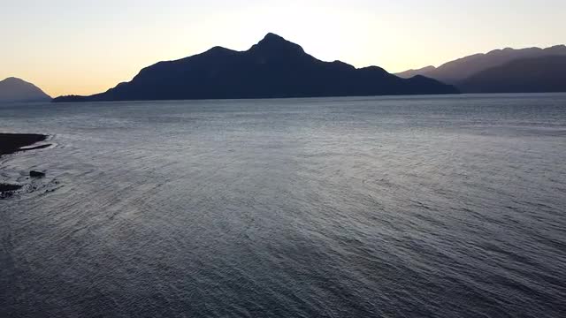 Fly over calm water in Canada during sunset with a mountains far away
