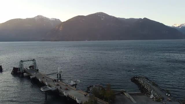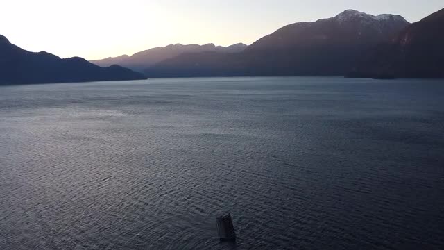 > Fly over calm water in Canada during sunset with a mountains far away