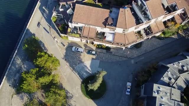 > Aerial view of Vancouver creek with a lonely yacht and beautiful autumn trees
