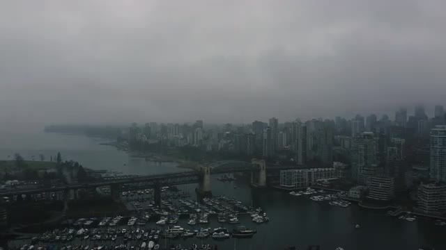 > Establishing aerial view of Burrard Bridge with the West Vancouver on the background.