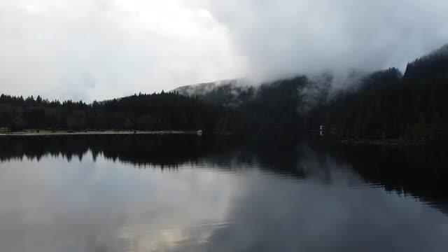 > Fly over the calm grey lake with the mountains on the background
