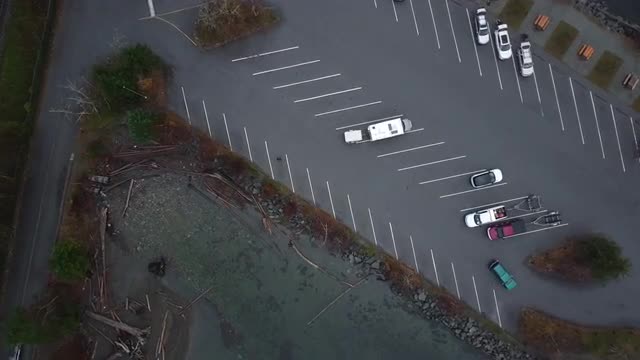 1130148 - Fly over seawalk with the creek and downown of Vancouver on the background