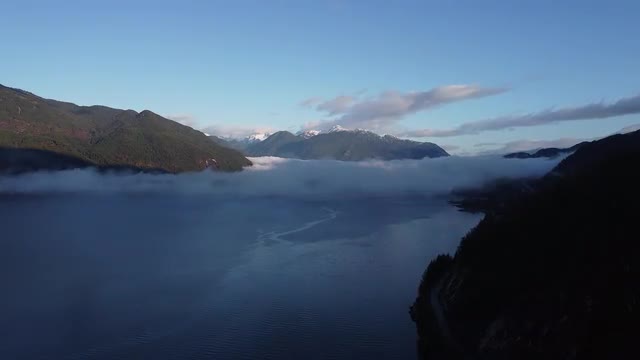 Mountains with the snow and low clouds over the river near Vancouver