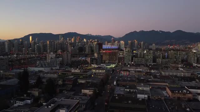 Evening view of the Vancouver downown and mountains behind it