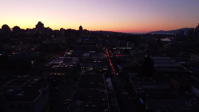 > Sunset fly over Broadway street in Vancouver