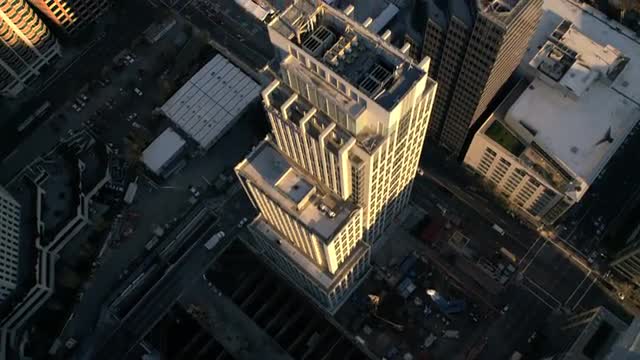 Aerial vertical view of rooftop Skyscrapers city buildings traffic in a modern capital metropolis, America shot in 4K UHD