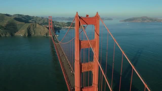Aerial overhead view Golden Gate Bridge Highway traffic California State Route 1 across the strait, San Francisco, USA shot in 4K UHD