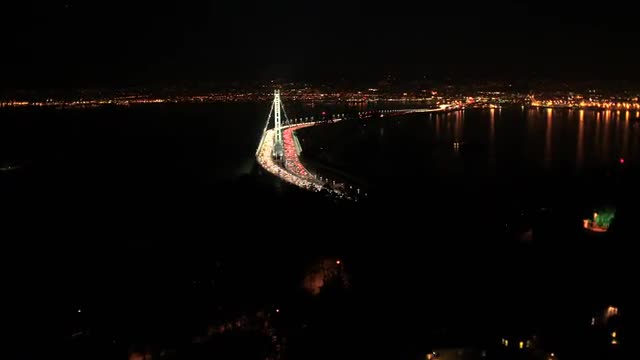 Aerial illuminated Highway traffic Interstate 80 low level view New Oakland Bay Bridge San Francisco city, California, USA shot in 4K UHD