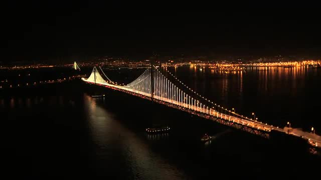 Aerial illuminated night view Highway vehicle traffic Interstate 80 Oakland Bay Bridge San Francisco city, California, USA shot in 4K UHD