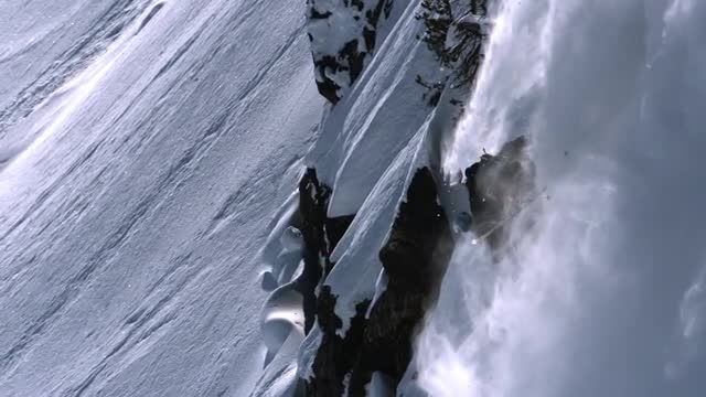 Skier hitting a large cliff surrounded by his sluff in the Whistler backcountry