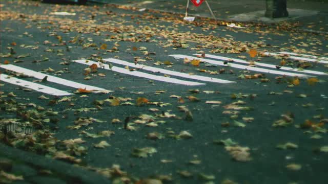 Leafs blowing across a sidewalk in slow motion
