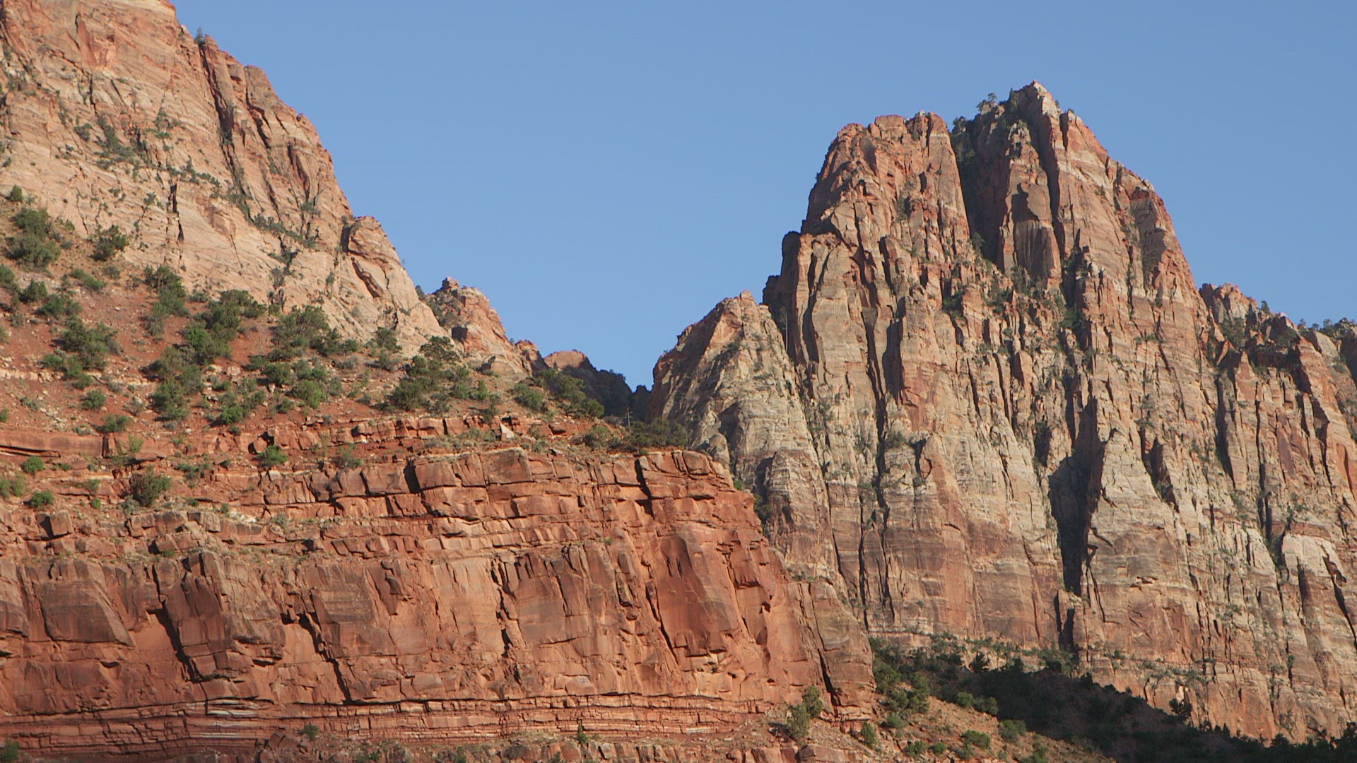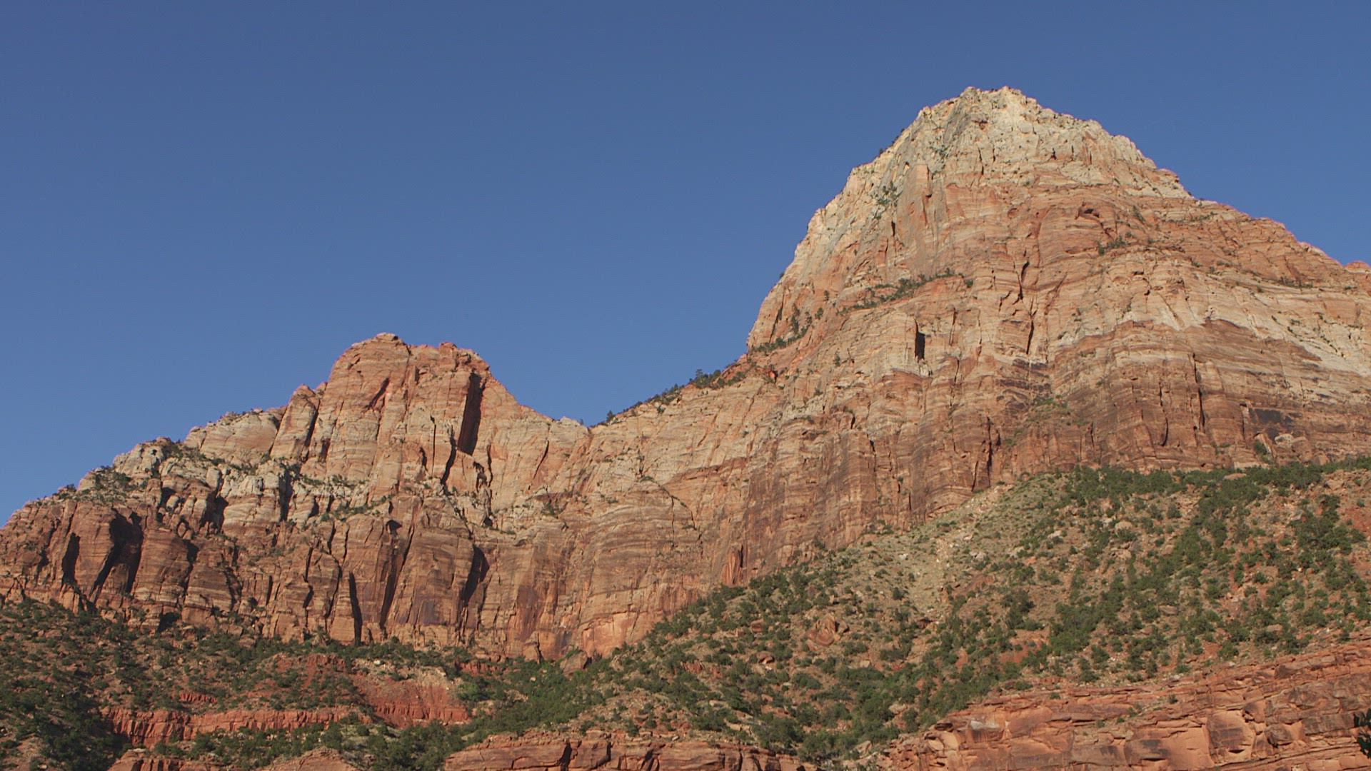 > POV Zion Valley vehicle road trip extreme terrain winter snow blue Zion Utah USA