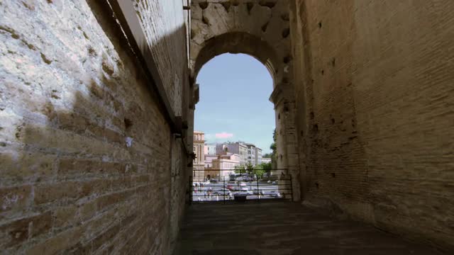 90683 - Italian buildings and cars seen through a Colosseum arch on a sunny day