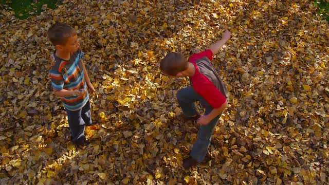 373088 - Two young boys playing in fall leaves.
