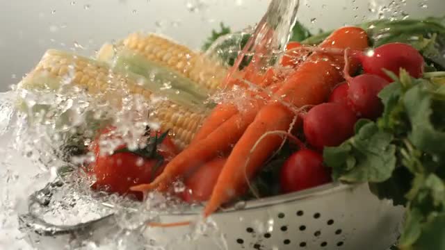 122221 - Water splashing onto fresh vegetables, slow motion