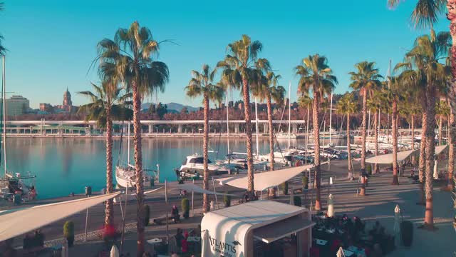 742768 - spain malaga sun light yacht dock tourist walking bay 4k time lapse