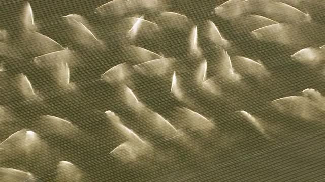 122382 - Aerial shot of irrigation sprinklers in field