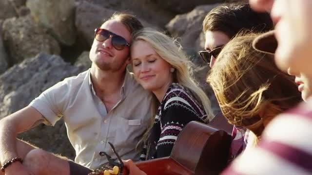 > Group of young people hanging out at beach around campfire