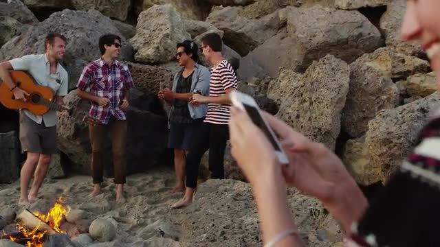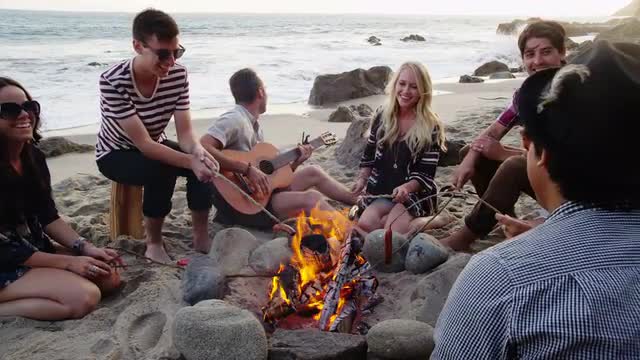 > Group of young people hanging out at beach around campfire