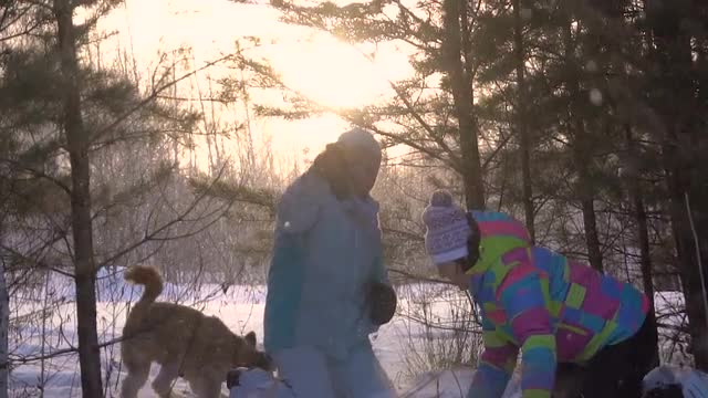 676886 - Slow Motion Two Adult Women Playing With the Dog in the Snow. Sunny Winter Day