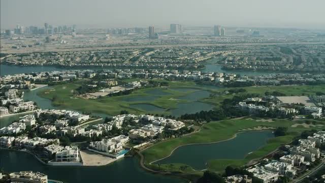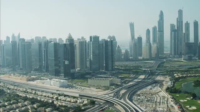 > Aerial shot of sand dunes at sunrise, Arabian Dessert, Dubai, UAE