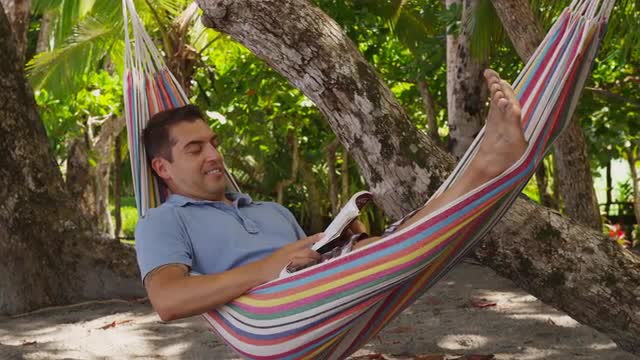 > Woman sitting in hammock reading book, Costa Rica
