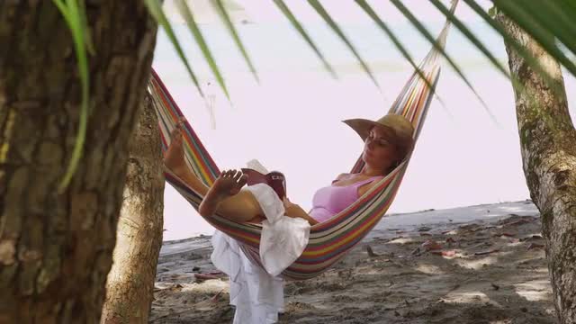 Woman sitting in hammock reading book, Costa Rica
