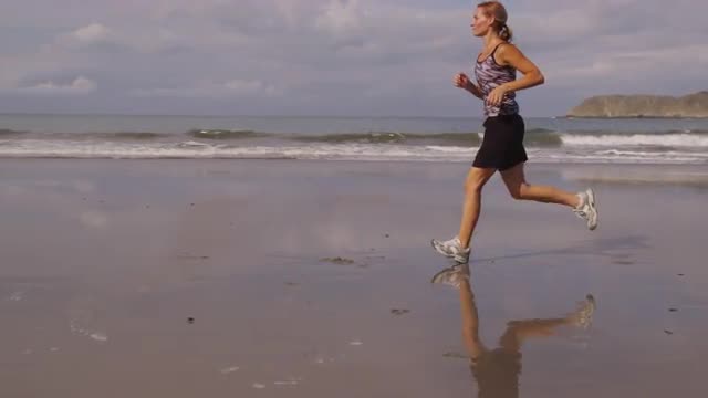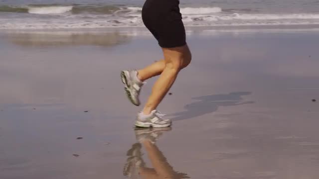 > Woman running on beach, slow motion